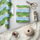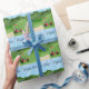 This sporty Golfing Father's Day Wrapping Paper features a golf course background with a sand trap and golf flag, a red golf cart, a blue golf cart both with golf bags. Stylised fish text is Happy Father's Day. Perfect for wrapping Father's Day Gifts. Choose your media and size of wrapping paper.