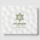 Golf themed Bar Mitzvah guest book with a golfball background and green grass accents. This golfing Bar Mitzvah guest book is stylish and modern. This golf themed Bar Mitzvah guest book features a subtle dimpled golfball background with a Jewish Star of David and golfing icon. The colours on this elegant golfing themed Bar Mitzvah design are white and green. Your son's name is in a bold font.