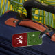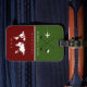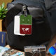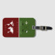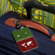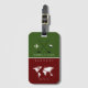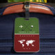 A nice red and green luggage tag for a golf player... his name, a small aeroplane, golf clubs, the map of the world...
