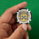 Spanish surname Gomez historical arms set on a mottled parchment style background. The reverse of the chip has the symbols for the four suits of cards; a black spade, a red heart, a red diamond, and a black club on the same parchment style background.