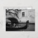 Black and white photo of a rain-soaked Gondola in Venice Italy.