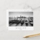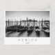 Photo postcard of a row of traditional gondolas in the water with Venice in the background in Italy in black and white with a white edge and the text 'Venice, Italy'.