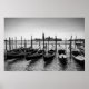 Poster print of a row of traditional gondolas in the water with Venice in the background in Italy in black and white.