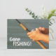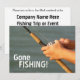 A fisherman holds his rod and reel, waiting for a bite as the late afternoon sun warms and lights up his hands. The Rippled water surface serves as the background with Gone Fishing in wet looking letters. Customise both sides with your company or event information.