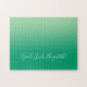 Light to dark green gradient jigsaw puzzle features "Good Luck, [NAME]" in a white script font near the bottom. Personalise the funny text in the sidebar. Makes a great custom gift for someone who loves a challenge.