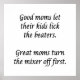 Funny design reads, in black letters,"Good moms let their kids lick the beaters. Great moms turn the mixer off first." Great for a laugh and those with a good sense of humor or humor. Terrific gift for any kid, old or young on a birthday, at Christmas, Kwanzaa. Great for mom on Mother's Day, too.