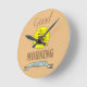The clock did not take as long to arrive as I thought it might and was extremely well packaged. I didn't do the measurements so I didn't realize it is a little smaller than the average clock but that does not matter (just make sure you check if that's important to you).It is really nifty! It seems very solid and well made not flimsy at all. It has been going well and has kept good time in its few weeks on my wall. Nice product. Gets noticed too! Nicer in real life than the picture but true to the picture