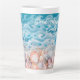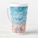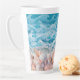Ocean waves and seashells tall mug. Greet yourself with this "good morning" latte mug and customise with your name. Perfect for sipping coffee or tea while enjoying a beach view, or just gazing out the back door. Use it as a reminder to have a good day at work, but just in case it's needed - envision yourself sitting by the sea and listening to the waves. White script is printed over rolling waves in pretty blue. Colourful seashells make up the bottom border. The design wraps around this tall latte mug leaving a white handle and rim.