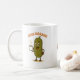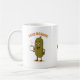 A good morning cartoon character holding a coffee mug. Would make a great gift for a pickle lover or a pickle collector.