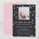 Good Night, Sweet Princess... Baby memorial card in darkest blue with pastel pink and yellow stars scattered around a photo of your child, a Shakespeare quote, and your text.