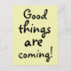 This is a cute cream colour inspirational quote postcard that says 'Good things are coming!' printed in cute cursive letters. The back says 'See other side' Perfect to encourage someone going through a difficult phase.
