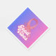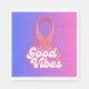 This vibrant breast cancer awareness napkin design features a pink ribbon adorned with delicate leaves and surrounded by sparkles, symbolising hope and positivity. The bold, white "Good Vibes" text adds an uplifting message. The background fades from blue to pink, creating an eye-catching, cheerful look.