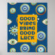 Good Vibes bring Good Luck, evil eye pattern is a fun and energetic design featuring lots of different styles of evil eye on a blue background.