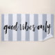 Soak up rays...and good vibes. Cute and cheeky beach towel features "good vibes only" in black handwritten style brush lettering on a background of wide stripes in light gray and white.