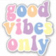 This custom-cut vinyl sticker features a colourful retro font that reads "good vibes only" in shades of pink, blue, orange, purple and yellow. Matching items with this design and other styles of typography prints are available in my store. Be sure to follow me for new product updates. Thank you for your interest in SapphireDesigns!