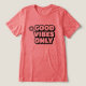 Spread nothing but positivity with the "GOOD VIBES ONLY" T-Shirt! This trendy tee features the bold, stylish text "GOOD VIBES ONLY" set against a cool graphic of a sun and stylized waves/rays, perfect for capturing that summer aesthetic. It's the ideal inspirational gift for friends, beach lovers, or anyone who wants to keep their energy high and their attitude positive. Great for casual wear, festivals, or your next vacation!
