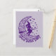 A purple witch sails across the starry sky in front of the moon on a lavender background