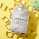 This Can Cooler features a Goodness & Mercy Iridescent Glitter Metallic Gold text design. The can cooler is an insulated polyurethane foam can cooler. The dimensions are 3" by 3.75". This can cooler helps to keep your hands warm and your cans cold. The can cooler fits 12 oz cans. You can get volume discounts for weddings and events.