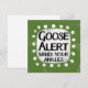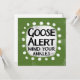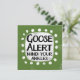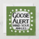 An irreverently weird typographic animal design that says "Goose Alert, Mind Your Ankles". It features black and red text on a white rectangle with funky, playful white dots surrounding it, all on a grey background.