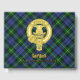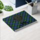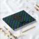 Clan Gordon crest badge surrounded by a strap and buckle over tartan background. Custom front, back and spine text.