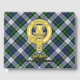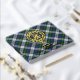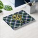 Clan Gordon crest badge surrounded by a strap and buckle over dress tartan background. Custom front, back and spine text.