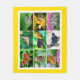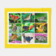 Fleece blanket with a collage of 9 photos of gorgeous butterflies, among them the Old World swallowtail (Papilio machaon), yellow, black, blue, and red; the peacock butterfly (Aglais io), red with colourful round spots; the black-and-blue blue tiger butterfly (Tirumala limniace), the buckeye butterfly (genus Junonia), brown with colourful round spots; and the fritillary butterfly, yellow with black spots.