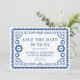 This beautiful papel picado inspired wedding save the date design features an ornate frame and text in blue, white background, and modern typography. This elegant yet modern design is a fabulous choice for a Latinx wedding or Mexico destination wedding. On the back is your own "full-bleed" horizontal photo, which can be removed if desired.