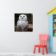 This gorgeous owl poster is simply beautiful, The owl has yellow eyes with a white 'face' and chest - lines of brown go through the white on the rest of the bird.