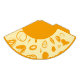 This paper party hat features a fun design based on circular lines, artistic spots and flat polka dots in dark orange on a yellowish white background. The upper part is the same colour as the print.