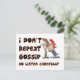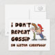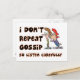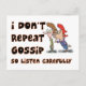A humourous look at gossip. A cartoon of two ladies. One whispering in the others ear. The words I don't repeat gossip So listen carefully surrounds them.
