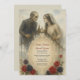 For couples who dare to say “I do” beyond the veil, this gothic zombie wedding invitation sets the perfect haunting tone. With vintage-style artwork depicting a skeletal groom and ghostly bride gazing lovingly across a wrought iron gate, it evokes romance from beyond the grave. Framed by red, black, and blue roses, this eerie yet elegant design blends dark romance with artistic storytelling. Ideal for Halloween weddings, horror lovers, or offbeat ceremonies, this invitation is fully customisable and delightfully unforgettable.