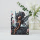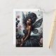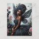 This enchanting fantasy postcard features a stunning dark-skinned fairy with ethereal black butterfly wings. She poses elegantly among lush blooming pink roses and rare black orchids, wearing a dramatic black gown of layered tulle and corset details adorned with delicate petals. Her voluminous hair is crowned with black roses and visited by fluttering moths and butterflies, enhancing the dark romantic atmosphere. Perfect for gothic fairy tale lovers, fantasy art collectors, or dreamy stationery enthusiasts, this image brings magic and mystery to any season—especially autumn or Valentine's Day with a goth twist!