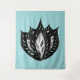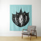 Goth flower tapestry - floral art with holes stipple shaded ink drawing in black and white over blue background and many dots.