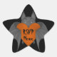 A cute goth vampire bat holding a big orange heart that reads "RSVP please" on fun star shaped envelope seals.