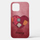 Goth themed iPhone case done in a red grunge background, with graphics of a black, red, orange and grey patched up heart. Personalise the black text to suit your needs.