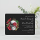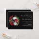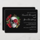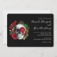 A wedding invitation with a goth style illustration. Beautiful red roses and gold leaves surrounding a black and white skull.