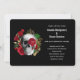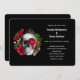 A wedding invitation with a goth style illustration. Beautiful red roses and gold leaves surrounding a black and white skull.