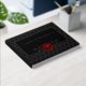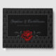 The Design features grey and black damask and a red, bloody rose. The font is in real silver foil that contrasts with the dark background. At the bottom there is a bleeding red rose giving a mysterious and slightly dark touch. The rose symbolizes love and passion while the blood represents the depth of emotions. Overall, the guest book exudes a certain drama and intensity that immediately attracts the attention of the recipient. It's perfect for couples looking for an unconventional and unique wedding.