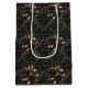 Gothic black and gold gift bag with black and gold roses, golden handwritten old script, elegant damask pattern and oval golden frame.