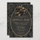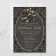 Gothic black and gold Halloween party invitation with black and gold roses, golden handwritten old script, elegant damask pattern and oval golden frame.