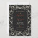 These 5" x 7" wedding invitations feature a gothic style with black and bone faux lace weathered paper and red roses with the introduction, "Together with their families, please join," along with placeholders for the wedding couple's first names, date, time, venue, venue address with the message at the bottom, "reception to follow."