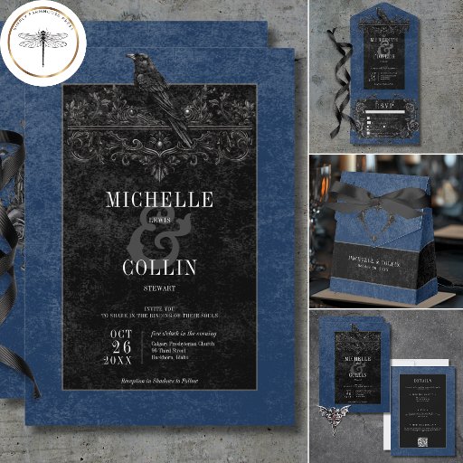 THIS IS AN ALL IN ONE INVITATION WITH ADDITIONAL DETAILS ON THE BACK. Transport your guests to a world of dark, enchanting elegance with our vintage gothic wedding invitation. The Victorian blue background sets the stage for a striking contrast, as bold white text emerges from intricate black text boxes. At the pinnacle of this invitation, a three-dimensional gothic border adorned with a regal black raven captures the essence of mystery and romance. Unleash the magic and set the tone for an unforgettable wedding day. Created by Simply Farmhouse Press.