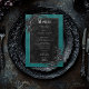 Transport your guests to a world of dark, enchanting elegance with our vintage gothic wedding menu card. The deep, aged teal background and black roses sets the stage for a striking contrast, as bold white text emerges from intricate black text boxes. The back is adorned with two intertwining vines of black roses as well as the couple's initials and wedding date, which adds a touch of dramatic allure. Unleash the magic and set the tone for an unforgettable wedding day. This card is part of the Created by Simply Farmhouse Press.