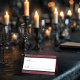 Transport your guests to a world of dark, enchanting elegance with our vintage gothic wedding place cards. The deep, aged burgundy wine background sets the stage for a striking contrast, as a bold white text emerges from a intricate black and grey outline. On the back of this design, a three-dimensional gothic filigree border with two black ravens captures the essence of mystery and romance. Unleash the magic and set the tone for an unforgettable wedding day. Created by Simply Farmhouse Press.