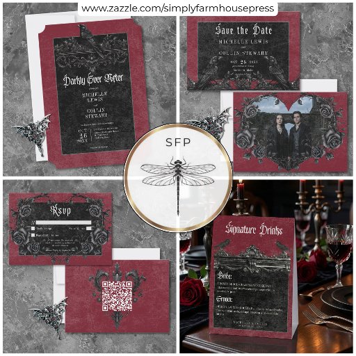 Transport your guests to a world of dark, enchanting elegance with our vintage gothic wedding thank you card. The deep, aged burgundy wine background sets the stage for a striking contrast, as bold white text emerges from intricate black text boxes. Three-dimensional gothic elements adorn the design, capturing the essence of mystery and romance. Unleash the magic and set the tone for an unforgettable wedding day. Created by Simply Farmhouse Press.