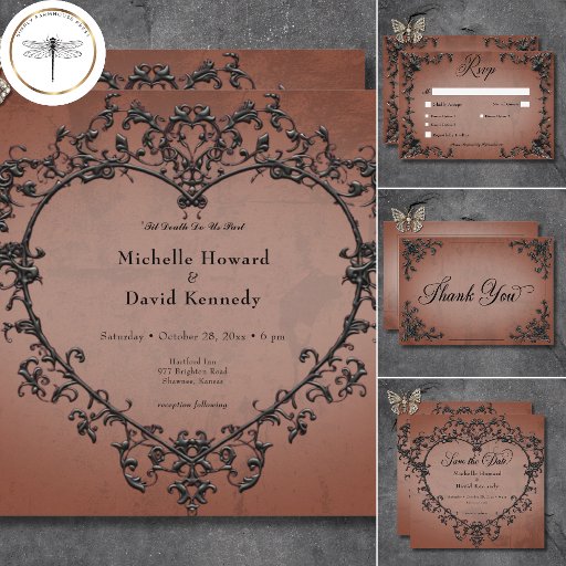 Gothic Black & Rust Filigree Heart Wedding Invitation