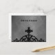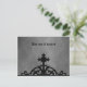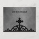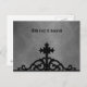 Elegant gothic post card with a wrought iron mediaeval cross gate topper silhouette at the bottom against a grungy fine damask background in black and grey tones. The text at the top is easily removable or changeable.