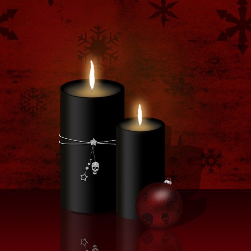 Gothic Christmas illustration featuring black candles with silver skull decoration and a red christmas bauble with black skulls on a grunge red-black background with snowflakes.