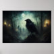 Enter the mystical world of this eerie forest raven illustration, where a solitary black raven perches amid a foggy, shadowy forest. The scene is illuminated by flickering torches, casting a haunting glow across the trees, while mysterious robed figures lurk in the background. This artwork captures the essence of gothic fantasy and supernatural intrigue, making it perfect for those who appreciate dark themes and the allure of the unknown.
