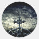 An iron gate from a grave featuring a cross against a dark and moody sky. These stickers make a great gift idea for Goths and cemetery lovers. These are a must see as the dramatic sky sets a dark scene.